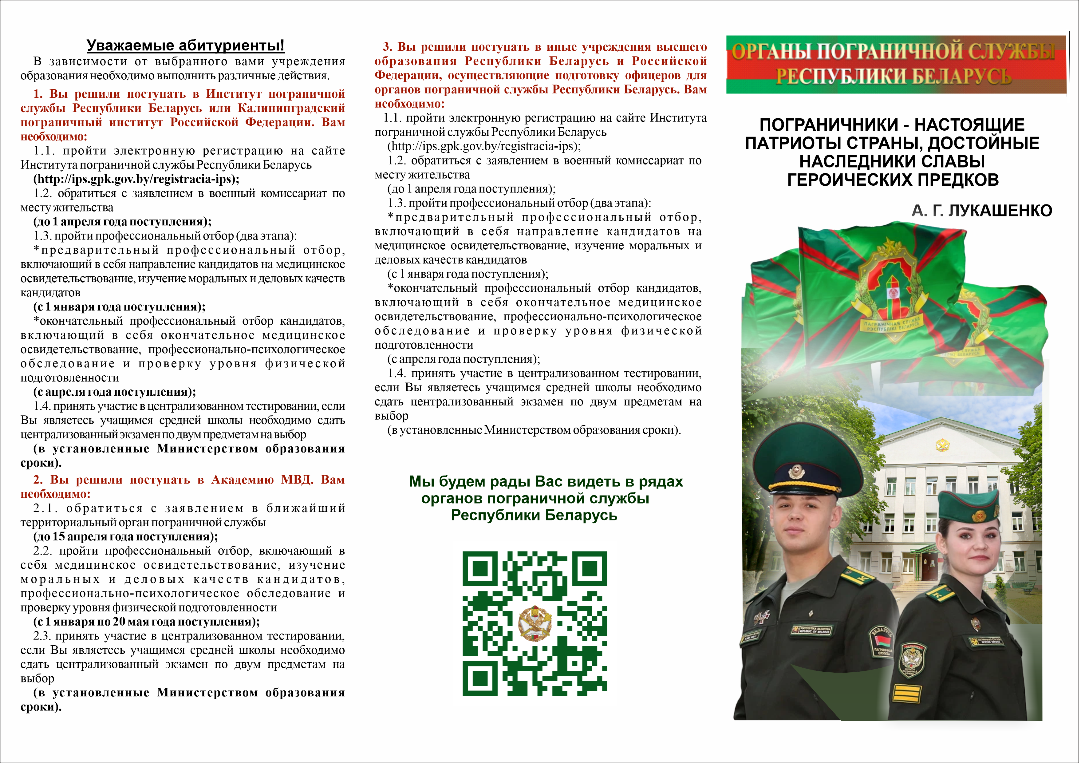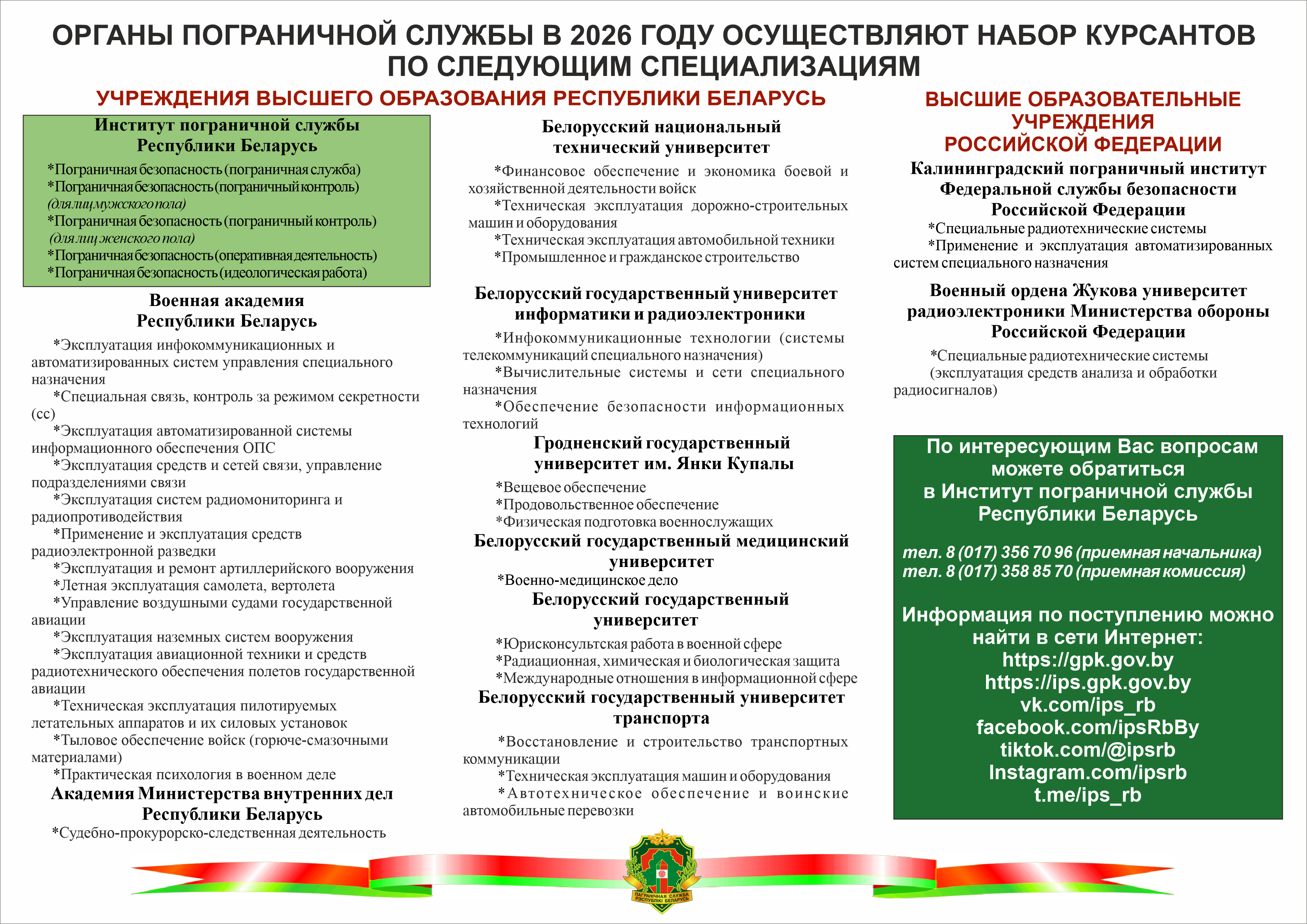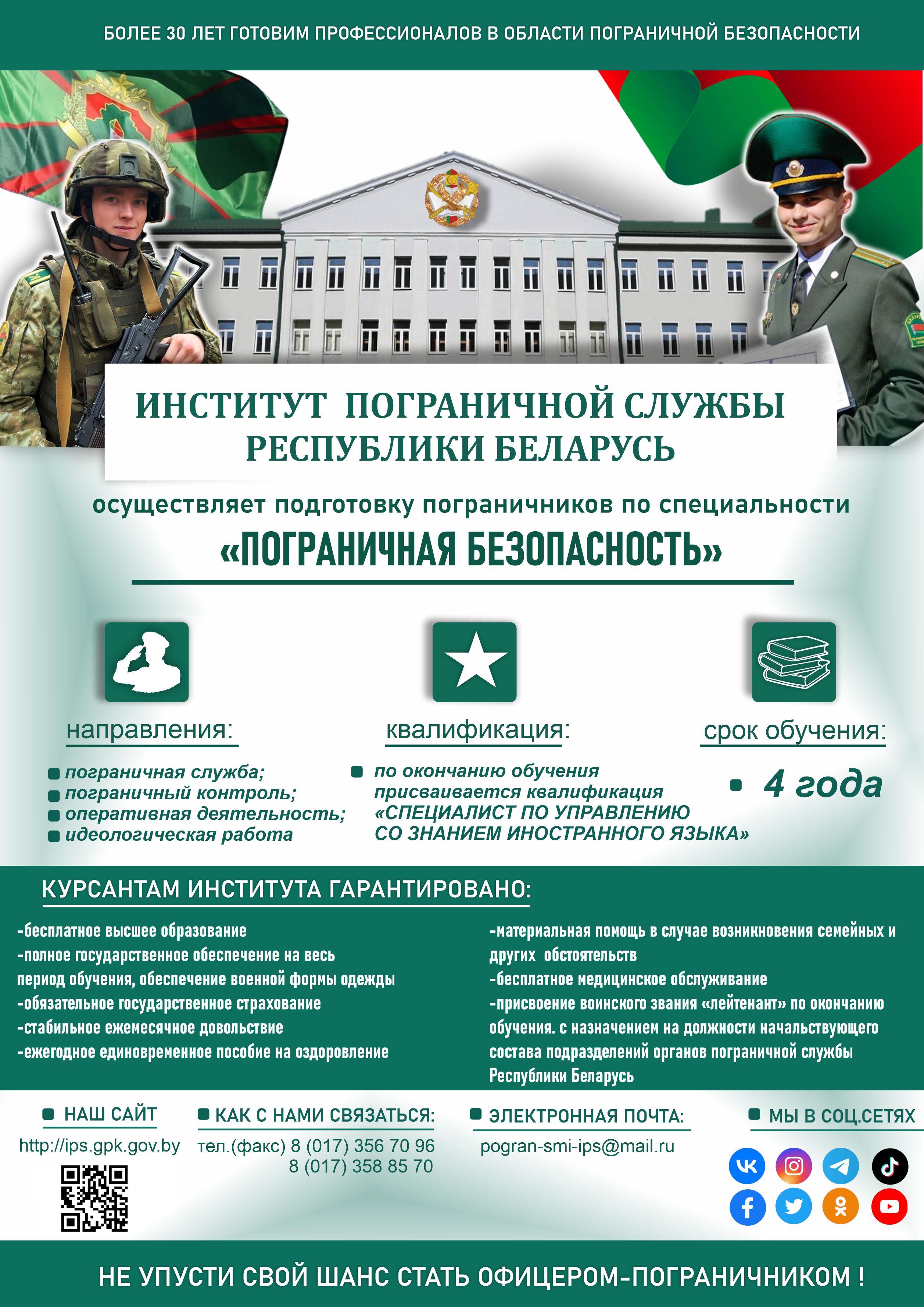 ВАЖНО!!! Набор в органы пограничной службы идёт на протяжении сроков, установленных законодательством Республики Беларусь до завершения приемной комиссии. При получении иной информации в военкоматах обращайтесь к секретарю комиссии Института (Анна Григорьевна, +375-29-779-49-45) для уточнения.